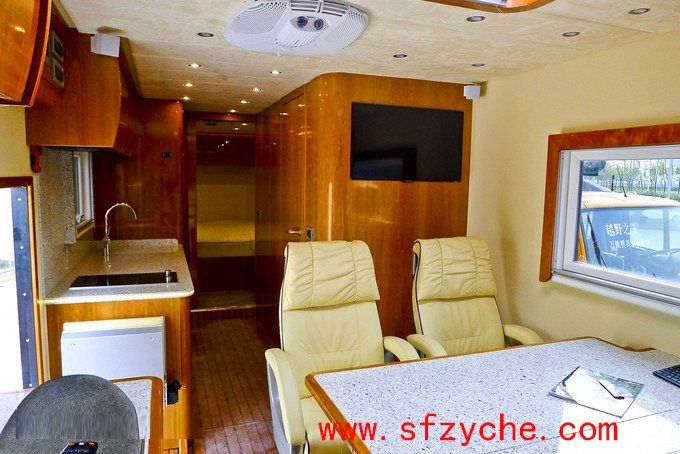 六驅(qū)越野房車車身內(nèi)整體豪華配置:在駕駛室中還有主流卡車中配備的天窗通風系統(tǒng)和后排折疊床板,這款越野房車的后排內(nèi)部具有地板加熱系統(tǒng),獨立的會客廳,高級絨布真皮座椅具備多項可調(diào)功能,雖然包裹感不是很強,但卻有一定的支撐性,更加符合越野房車的特質(zhì)。此外,中央空調(diào)、天窗與側(cè)窗外加頂部迎賓燈的點綴是恰到好處,前后對著的兩臺大尺寸液晶電視方面中央四位乘客觀看。在門口的兩側(cè),分別是吧臺和迷你廚房,電磁爐、微波爐、冰箱應(yīng)有盡有。車門頂部設(shè)有整車電路控制面板,可通過開關(guān)控制燈光、車門等等。干濕分離的衛(wèi)生間分別分布在客廳旁與臥室中,其中一間設(shè)有浴盆和真空馬桶,另一間則配有恒溫淋浴,走廊的盡頭就是這間臥室,其擁有電控臥室門,獨立中央空調(diào)、屋內(nèi)整體照明系統(tǒng)與液晶電視,此外整間臥室采用了實木裝潢,超寬的雙人床鋪足夠車主享用。