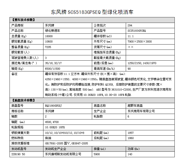 潤知星牌SCS5183GPSEQ四驅(qū)越野消防灑水車,東風(fēng)越野四驅(qū)森林消防供水車采用東風(fēng)D913新款駕駛室(可選裝老款153駕駛室),4*4驅(qū)動,ISB190 50國五發(fā)動機(jī),4500mm/4700mm軸距,東風(fēng)六檔變速箱,10.00R20鋼絲胎,東風(fēng)商用車前后橋,罐體采用優(yōu)質(zhì)碳鋼QB235板材,罐體容積11.1立方,前沖后灑,側(cè)噴,后置工作平臺帶消防水炮,可選裝消防炮,消防泵等專用消防設(shè)備。主要用途:中國森林林業(yè)部門的森林消防滅火供水及利用車載消防泵消防炮進(jìn)行遠(yuǎn)程消滅森林火災(zāi)。