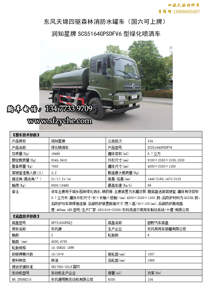 東風(fēng)天錦四驅(qū)森林消防灑水車_國(guó)六排放潤(rùn)知星牌SCS5164GPSDFV6型四驅(qū)越野綠化噴灑車采用DFV2163GP6DJ型國(guó)六排放東風(fēng)天錦四驅(qū)越野底盤,東風(fēng)天錦D530一排半駕駛室,4×4驅(qū)動(dòng),康明斯B6.2NS6B210國(guó)六發(fā)動(dòng)機(jī)210馬力,最大扭矩850N.m/1100-1700rpm,排量6.2L、韶齒手動(dòng)六檔變速箱,東風(fēng)德納車橋,前驅(qū)動(dòng)橋4.5噸,后橋10噸,10.00R20輪胎,軸距4500mm/4700mm,電動(dòng)玻璃,方向助力,斷氣剎,ABS,大燈自動(dòng)調(diào)節(jié),自動(dòng)調(diào)整臂,選裝原廠空調(diào)。罐體采用優(yōu)質(zhì)碳鋼Q235板材,板材厚度4mm,罐體容積8.7立方,安裝夾心取力器,后置泵箱,消防栓接口左右各一個(gè),消防炮采用PS30-50D消防水炮,流量40L/S/1.0MPa 水射程:≥50m,消防泵采用常壓消防泵型號(hào):CB10/40車用消防泵,流量:40L/s,壓力:1.0MPa,駕駛室頂部安裝長(zhǎng)條警燈帶喊話器,兩側(cè)噴涂白色森林消防字樣。