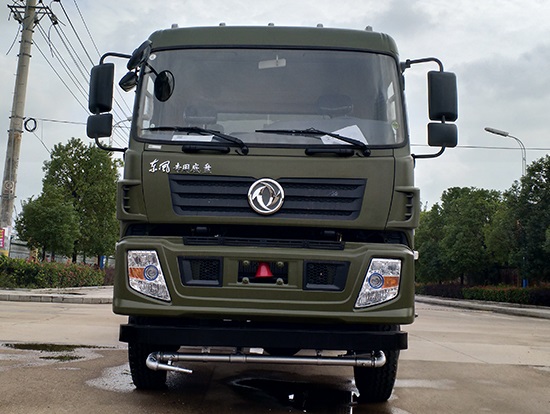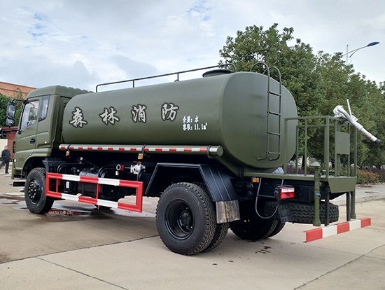 采用東風(fēng)EQ2180GD5DJ型越野汽車底盤,東風(fēng)一排半寬體駕駛室,4×4驅(qū)動,康明斯ISB190 50國五發(fā)動機(jī),六檔變速箱,東風(fēng)商用車橋,前驅(qū)動橋3.8噸,后橋10噸,10.00R20輪胎,軸距4500mm,電動玻璃,方向助力,斷氣剎,ABS。罐體采用優(yōu)質(zhì)碳鋼QB235板材,板材厚度4mm,罐體容積11.1立方,變速箱安裝取力器,大功率水泵可泵進(jìn)泵出,后置工作平臺帶水炮射程25米,消防栓接口左右各一個,選裝駕駛室頂部安裝長條警燈帶喊話器,全車顏色軍綠,兩側(cè)噴涂白色森林消防字樣。