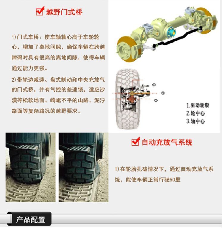 最大爬坡度:≥60% 前后車橋:帶輪邊減速、盤式制動器門式橋,并有氣動控制的差速鎖