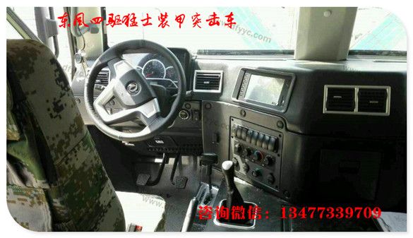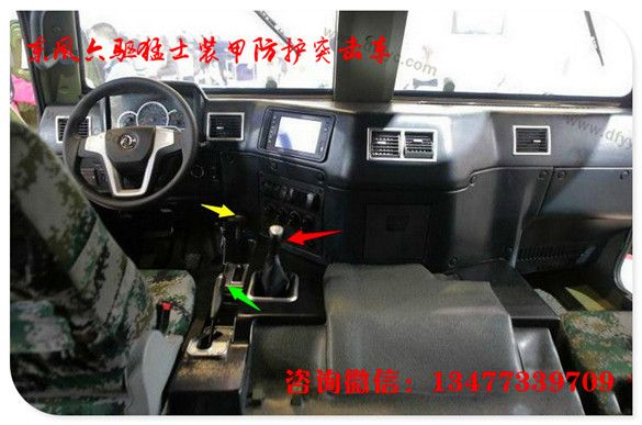 上圖是6輪驅動長軸2代猛士裝甲車駕駛艙特寫。較1代猛士裝甲車有24處改進。諸如:粗握把3幅面方向盤可以減緩駕駛員操作時的疲勞程度(1代猛士的方向盤為細握把,駕駛時間超過2小時手掌酸痛)。全新的組合儀表,將發(fā)動機轉速、車速、發(fā)動機水溫、機油壓力、蓄電池電壓顯示的更加清晰。各個功能按鍵全部改為由上至下按壓式大尺寸開關。而輪胎壓力調節(jié)開關從儀表臺左下側轉移至右側(此處改進有助于駕駛員快速操控)。