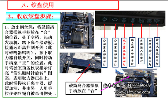 1、放出鋼絲繩:將鼓筒離合器操縱手柄放在“合”的位置,變速器處于空檔,起動發(fā)動機(jī),踏下離合器踏板,接通遠(yuǎn)距離控制開關(guān)(此時蜂鳴器鳴叫),按下取力器自鎖開關(guān),同時轉(zhuǎn)動手柄至“正”的位置,此時駕駛室頂蓋儀表指示燈亮“箭頭順時針旋轉(zhuǎn)”圖案,表明取力器已掛上,此時慢慢松開離合器,緩緩加油,并由另一人用手拉住鋼絲繩自被牽引物處 。