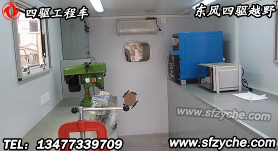 廂體頂部封閉,不可開啟。可配裝功率相當、其他型號的發(fā)電機組。駕駛室前方安裝電動絞盤、廂體前部安裝備胎和可升降照明裝置、廂體內(nèi)部安裝有發(fā)電機組、電焊機、線纜盤、臺虎鉗、切割機、工作臺等維修工具。側(cè)防護、后防護與車輛均采用焊接連接,材料均為:Q235,后防護斷面尺寸(mm):100×60, 離地高度:500 mm.